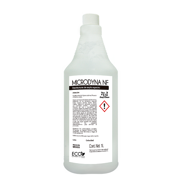 MICRODYNA NF es un desinfectante y sanitizante cuaternario de cuatro cadenas y amplio espectro, recomendado para eliminar bacterias Gram (+), Gram (-), hongos, mohos, virus y otros microorganismos.